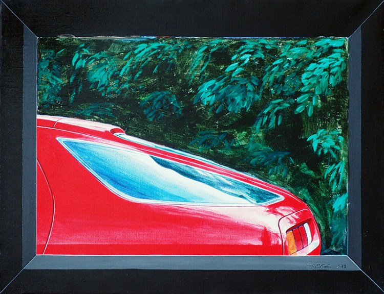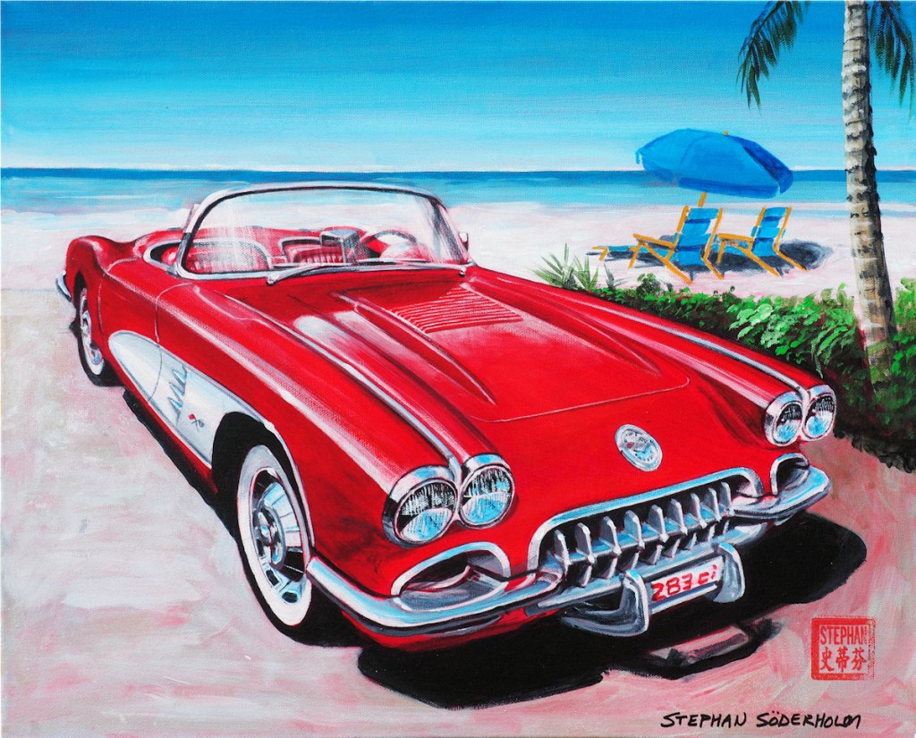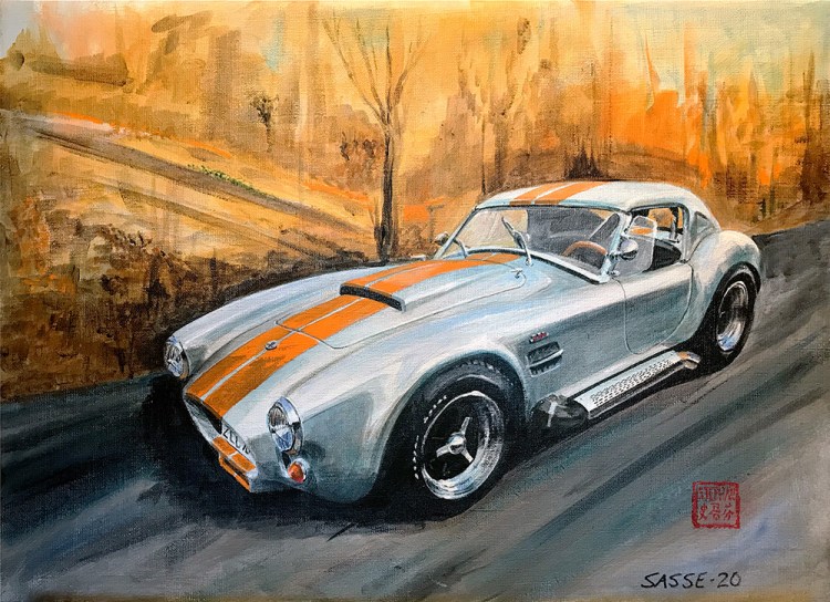 Akryl på duk. En legendarisk bilmodell med V8. Caroll Shelby, vinnare på Le Mans 1959, skapade en succé då han byggde om engelska sportvagnen AC Ace med en kraftig amerikansk Ford V8. Den här i silver med läckra ränder i orange och en Hard Top.