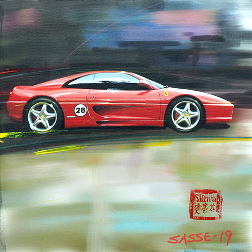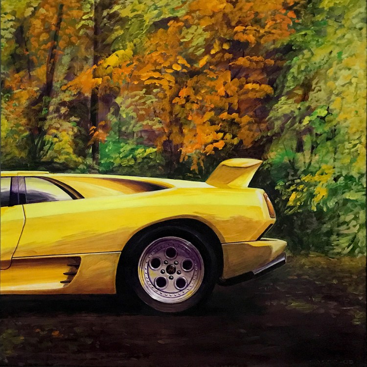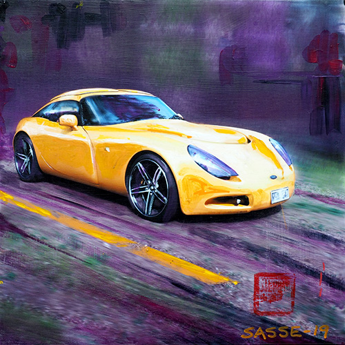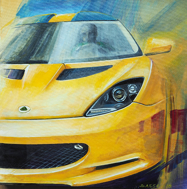 Akryl på duk. Rena dynamiten! Lotus skapade en ny modellserie 2000 genom att byta motor på Elise och styla om lite. Kompressormatad V6:a på 436 hk ger 2,5 kg/hk i den här modellen.