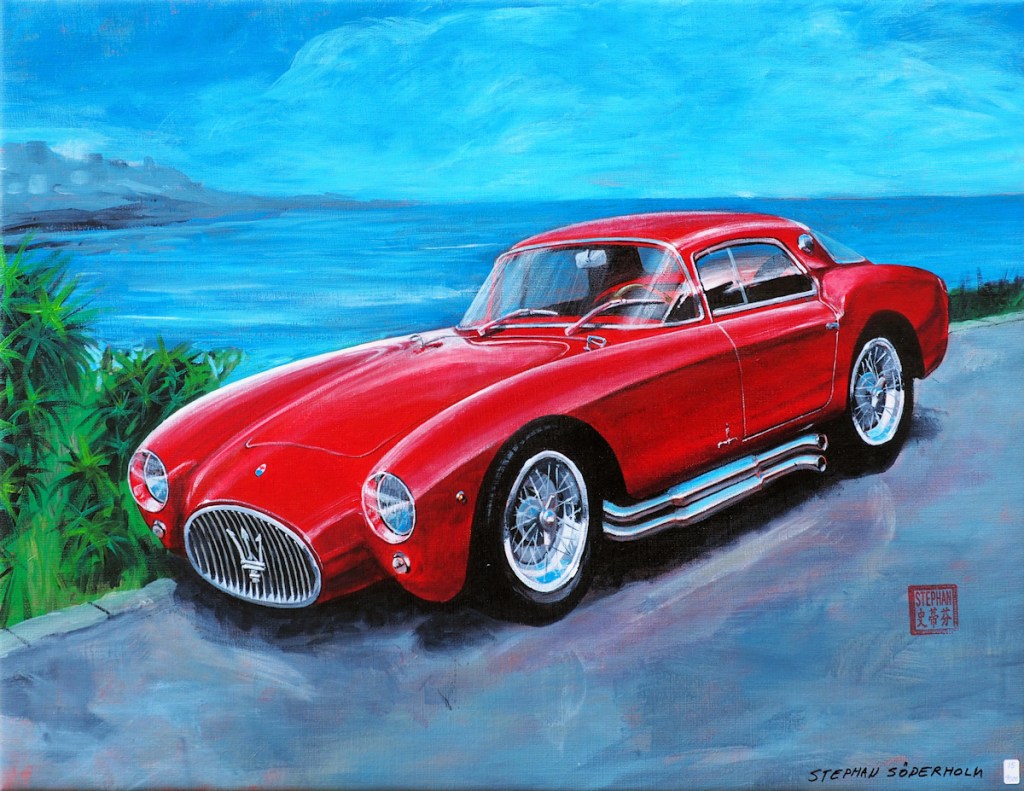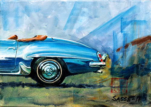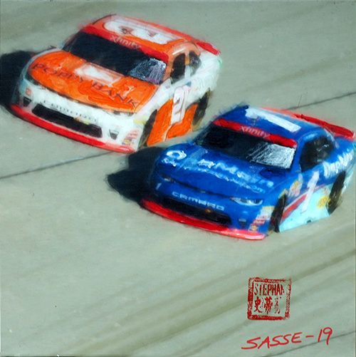 Som tur är växte jag upp när bilar hade karaktär och olika egenskaper. Här har jag försökt tolka ett par älskade och framgångsrika med olika köregenskaper. Just här leder en Abarth med märkbar överstyrning över en Cooper med lika tydlig understyrning. Jag har målat ögonblicket med akrylfärg på linneduk.