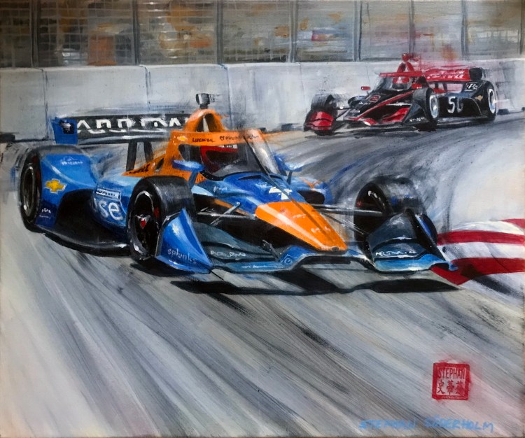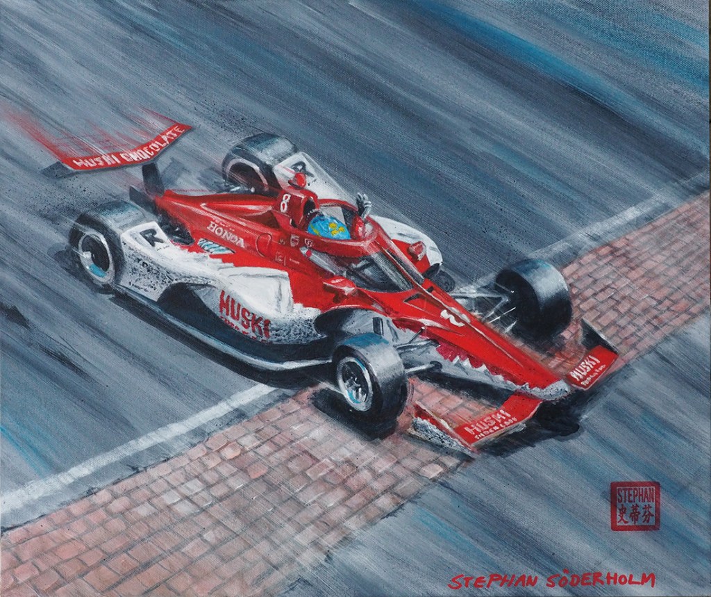 Seger i Indy 500. Marcus Ericsson blev den andre svenske föraren att vinn det berömda loppet på banan i Indianapolis. Jag försökt porträttera honom när han korsar mållinjen med tegelstenarna, rester från då hela banan var byggd av tegelstenar.
