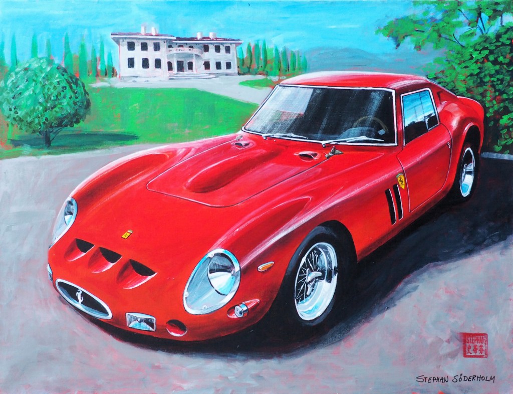 Ferrari 250 GTO är nog världens största bilikon. Här har jag försökt tolka träningen inför ett lopp på Silverstone med Graham Hill och Bette Hill, som var framstående på att hålla kollen på hela racet med mellantider, strategier och allt annat.